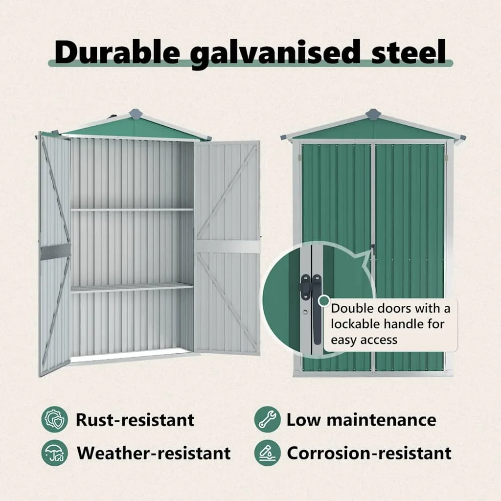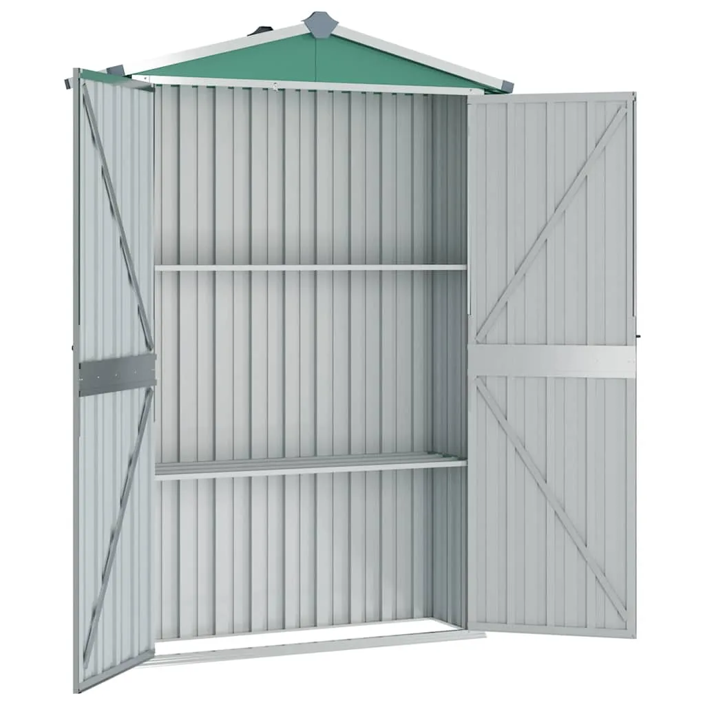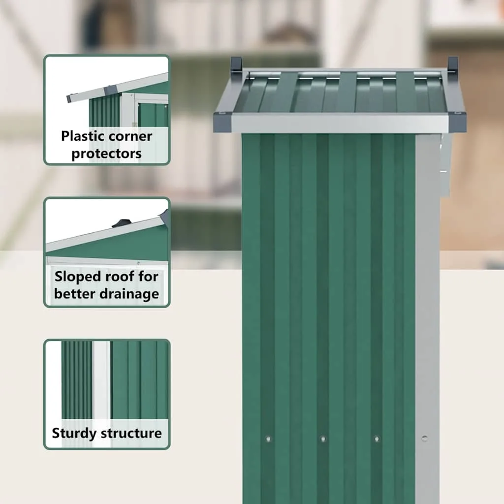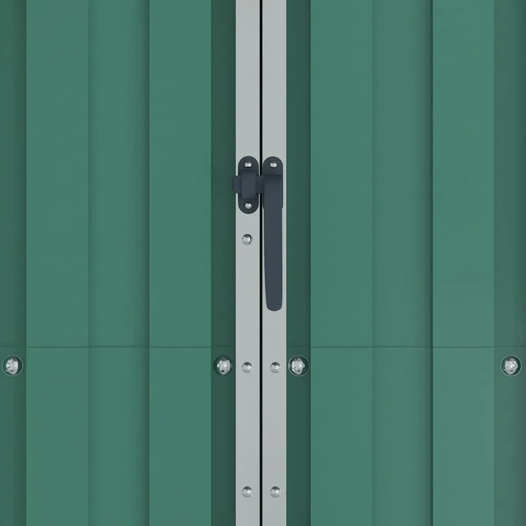 This storage shed is equipped with ventilation holes that ensure ventilation to reduce the accumulation of moisture and odors in the house. With shelves, it offers enough storage space to keep your essential items organized. Furthermore, this outdoor storage shed made of galvanized steel requires minimal maintenance and is very durable. The front double-opening doors allow for easy entry and exit. Rainwater drains automatically from the roof thanks to the sloping design.