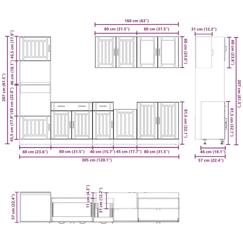 - 1 x kitchen cabinet: 60 x 57 x 207 cm (W x D x H)