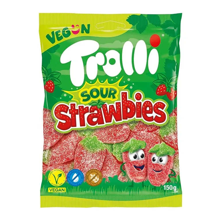 Vahvalt hapud ja magusad Trolli maasika kummikommid panevad näolihased tööle ja toovad naeratuse huulile! Need närimiskommid ühendavad hapu ja magusa ideaalses tasakaalus ning pakuvad tõelist maitseelamust nii suurtele kui väikestele.