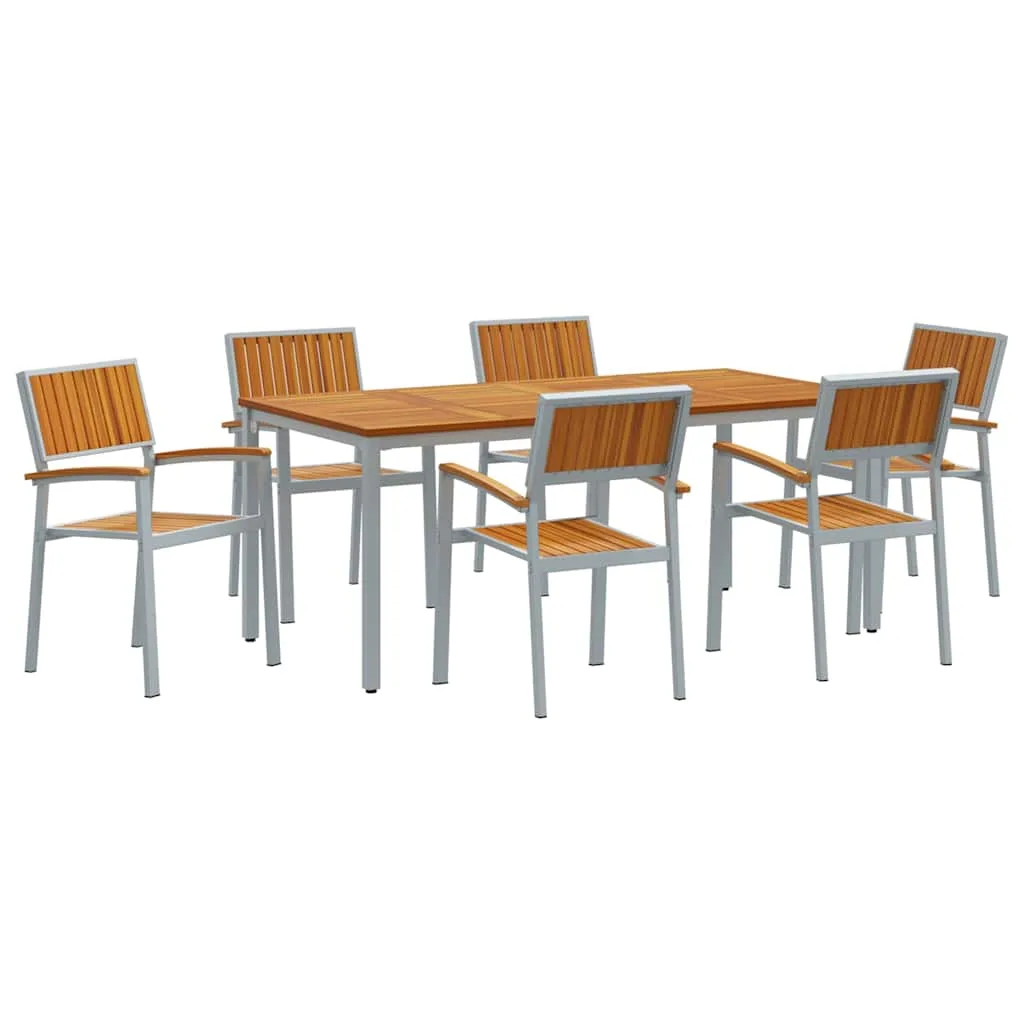 • Kestvad materjalid: See komplekt on tehtud kvaliteetsest massiivsest akaatsiapuidust, mis on tagasihoidliku pruunika värviga ja loomulikult vastupidav ilmastikule ja kulumisele, tehes selle ideaalseks välitingimustes kasutamiseks. Terasest detailid lisavad tuge ja stabiilsust, tagades, et su komplekt on iga päev stiilne.
