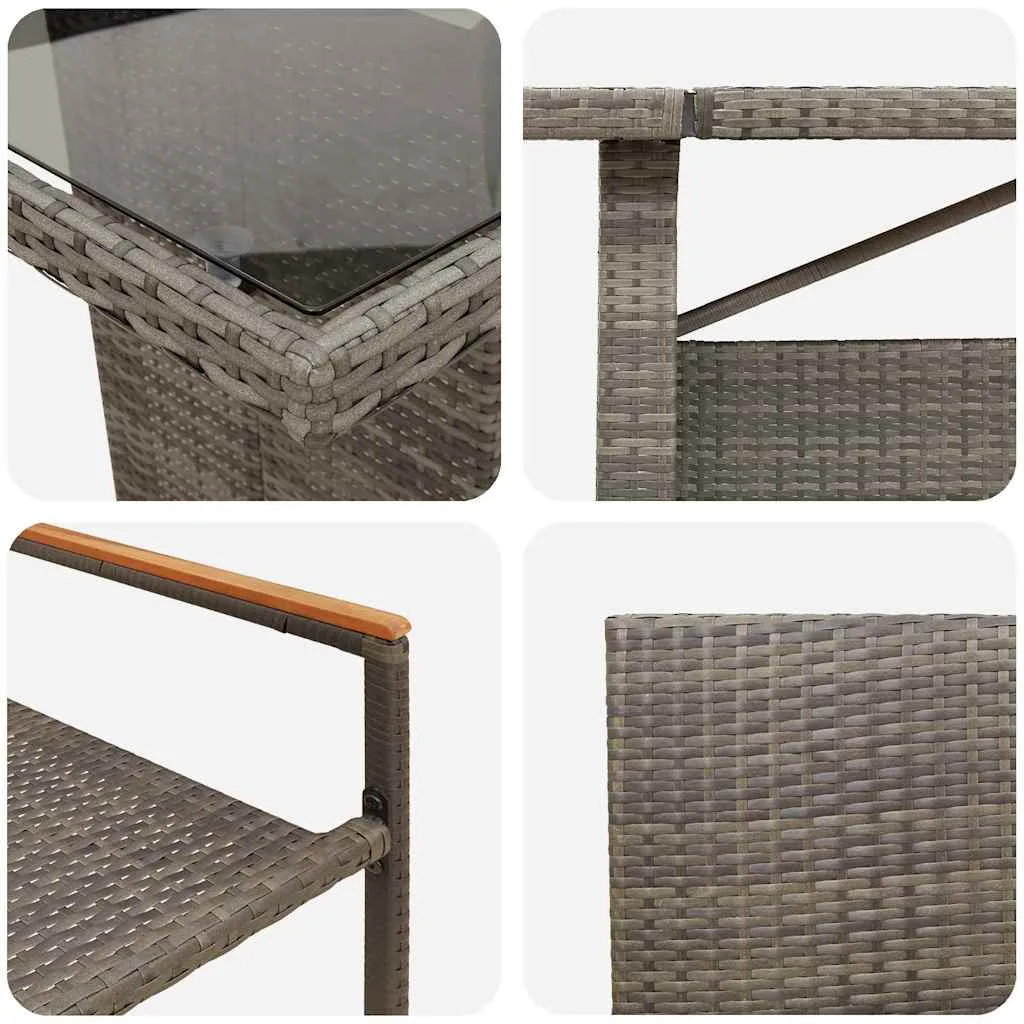 - Polürotangi ehitus Kvaliteetsest polürotangist ehitatud, tagab see söögikomplekt vastupidavuse ja stiili, olles samal ajal ilmastikukindel, sealhulgas vihma ja UV-kiirguse suhtes. Tugev materjal teeb sellest pikaajalise lisa igasse välistingimustes.