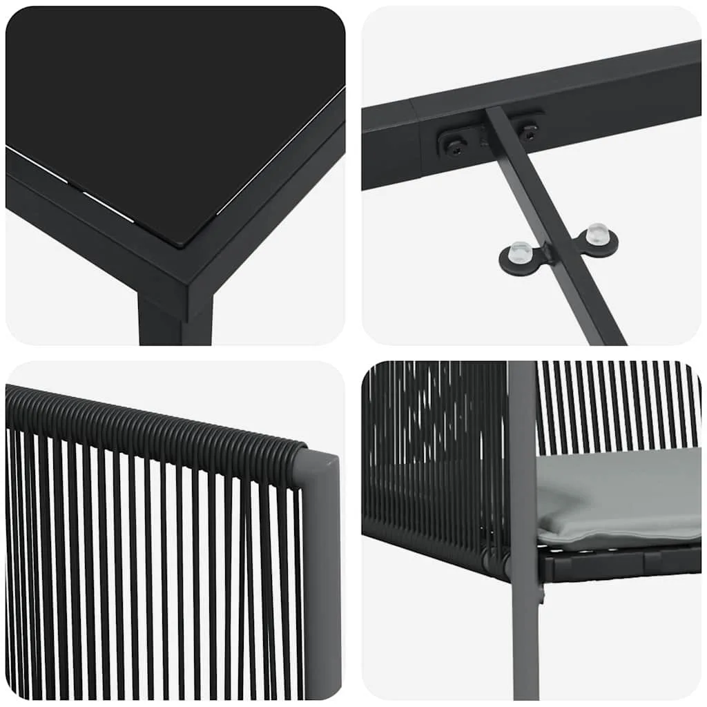 • Materjalid: Komplektil on polürotangist ja pulbervärvitud terasest raam, mis annab nii kaasaegse kui robustse ilme. Polürotang on tuntud oma UV-kiirguse ja kiire kuiva omaduse poolest, samas kui struktuur teeb komplekti vastupidavaks ja kestvaks.
