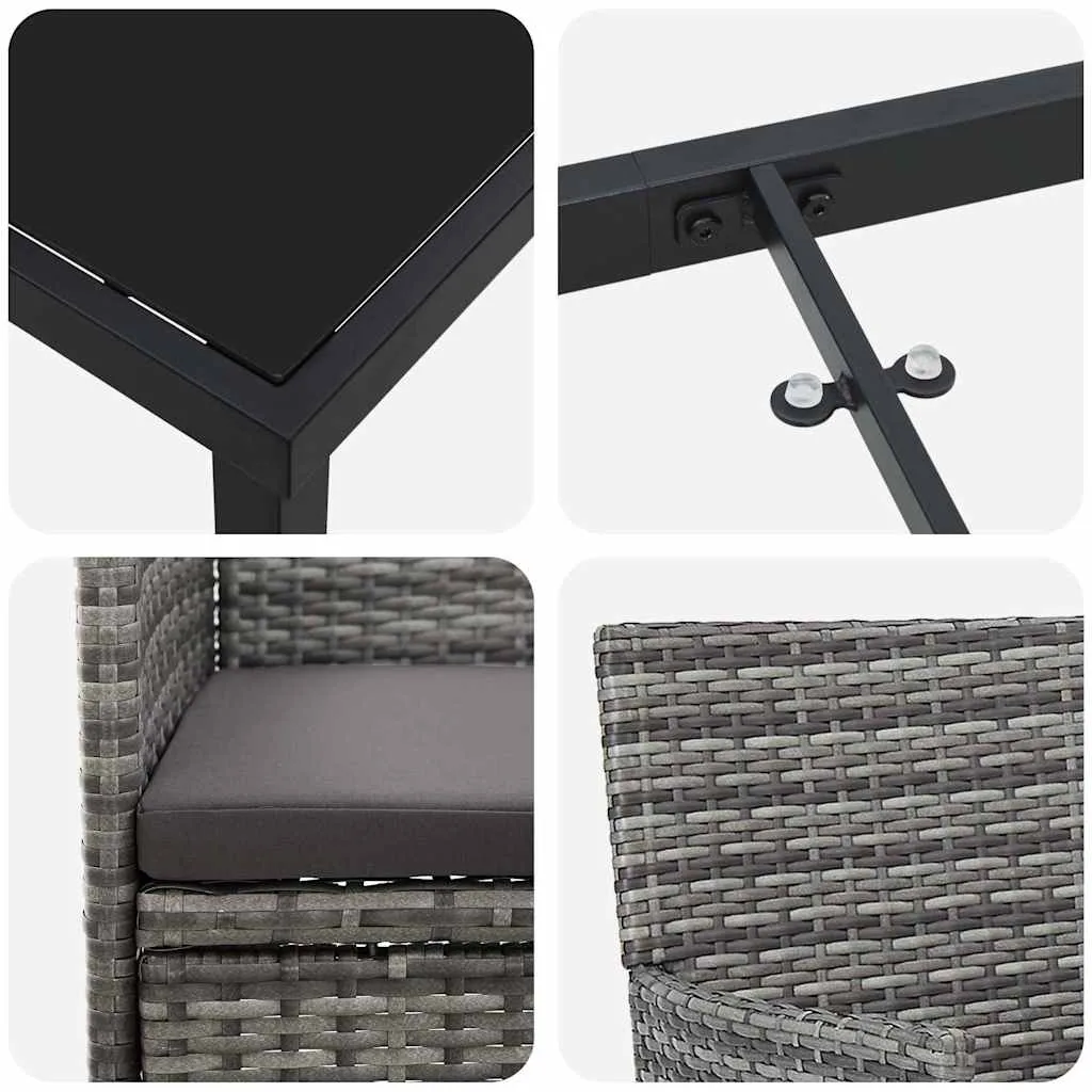 • Polürotangist seljatugi ja käetugi: Polürotanki kombinatsioon seljatoes ja käetugedes toob stiili ja mugavust, koos ergonoomilise toetusega. Polürotang on tuntud oma UV-kindluse poolest, hoides selle värske välimuse ka otsese päikesevalguse käes ja püsides visuaalselt atraktiivne läbi aastaaegade.