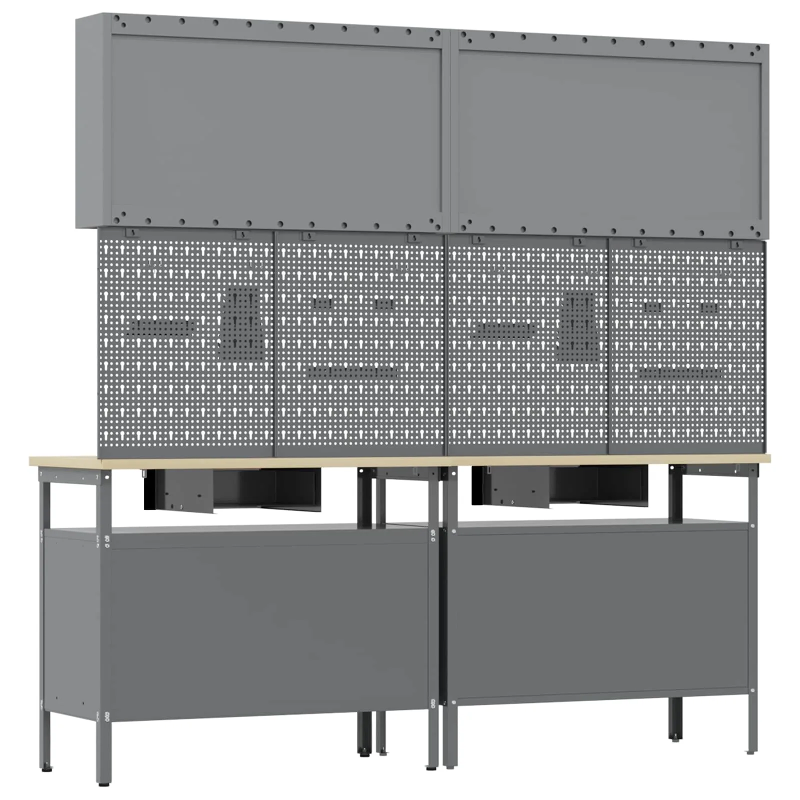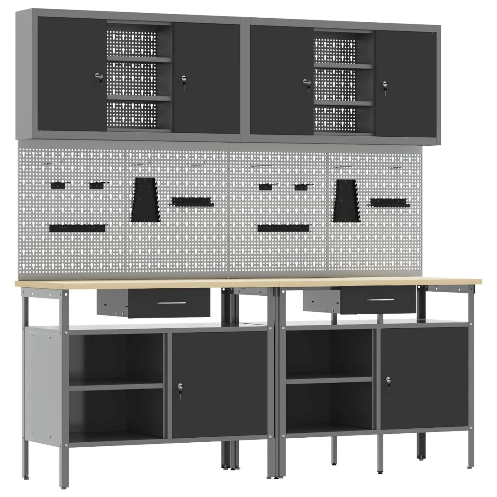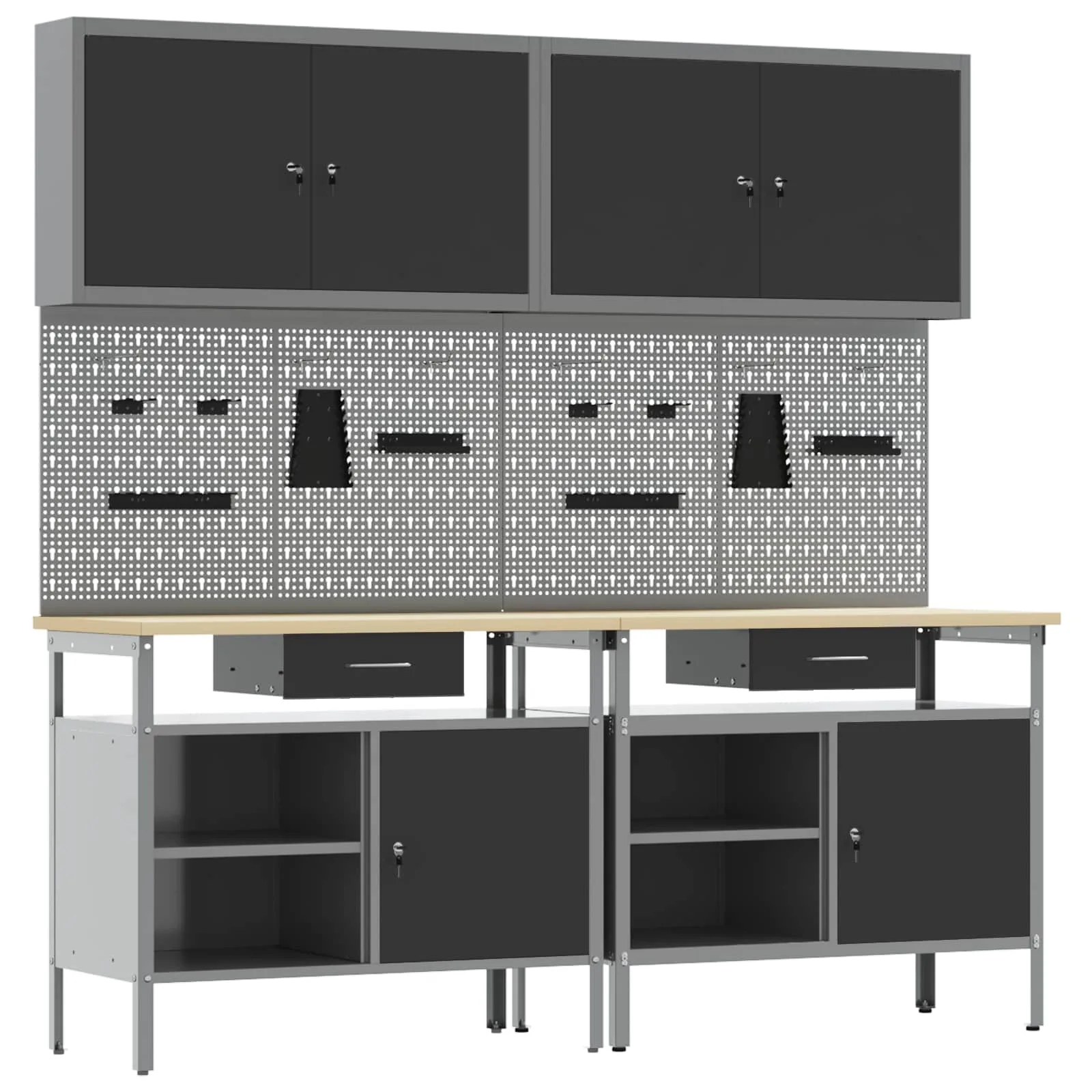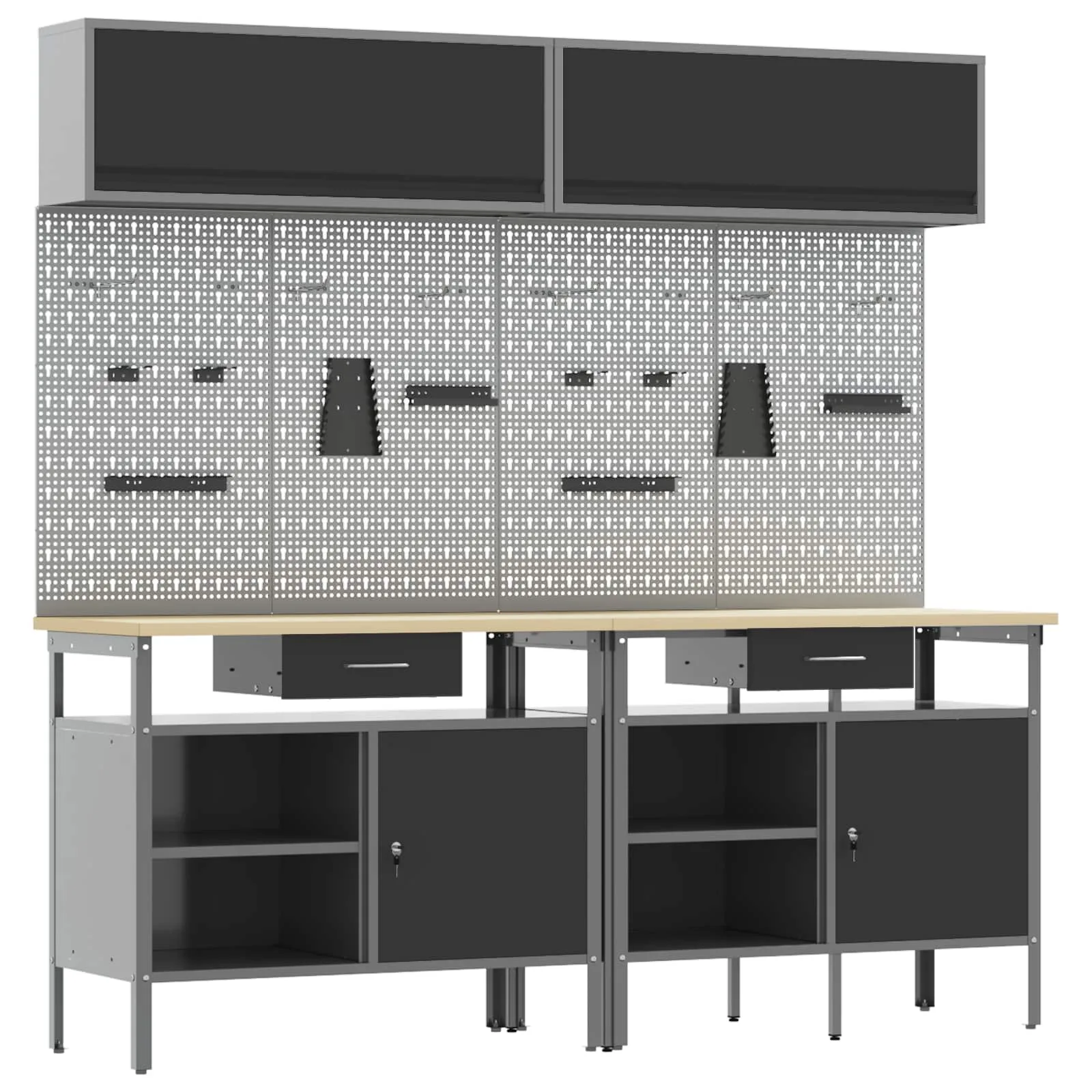 - Metallriiulid: Komplektis olevad metallriiulid pakuvad rohkelt ladustamisruumi, võimaldades sul oma tööriistu ja seadmeid korralikult paigutada. Need on konstrueeritud raskete ülesannete jaoks, toetades suurt kaalu ning vähendades vajadust pideva organiseerimise järele.