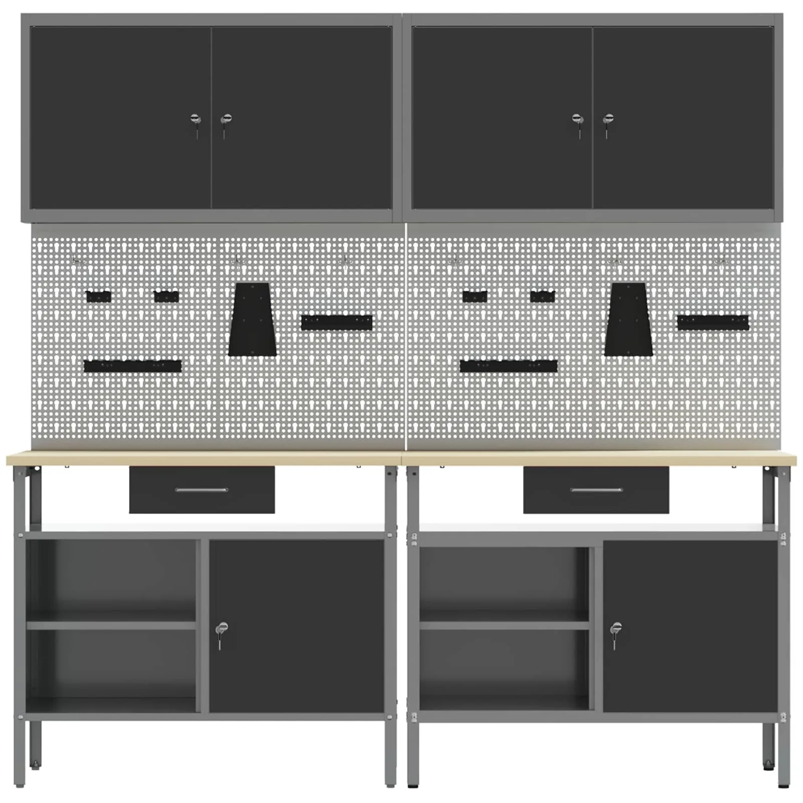See terase tööpinkide komplekt on ideaalne segu funktsionaalsusest ja tööstuslikust stiilist, sobides nii professionaalsetesse töötubadesse kui ka kodu garaažidesse. Ristkülikukujuline pink on konstrueeritud nii, et see talub raskete ülesannete täitmist, omades sujuvat disaini ja sileda tekstuuri, mis sobib ideaalselt igasse tööruumi. Metallriiulite abil, mis pakuvad laialdasi ladustamisvõimalusi, on see pink ideaalne tööriistade ja tarvikute korraldamiseks, tänu millele saavad nii professionaalid kui ka hobikunstnikud oma ülesandeid tõhusalt täita. Kujutle seda pinki oma tööruumi keskseks osaks, mis loob õhkkonna, mis toob esile professionaalsuse, korraldust ja stiili.
